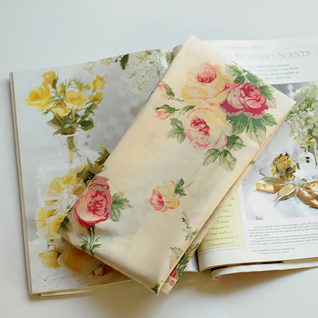 110cm幅で1.5mの長さのはぎれです。 80番ローンの生地に大輪のローズ3輪の華やかな生地です。 秋のインテリアに少し甘いローズがあると優しい雰囲気になります。 共布で広い幅のフリルを作ってクッションいかがでしょうか?