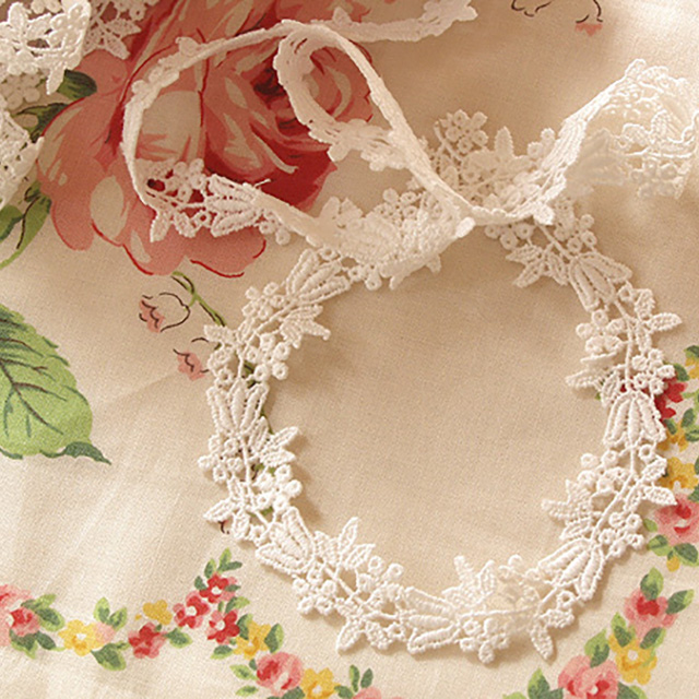 レース幅1.5cmで一枝にチューリップ、小花、葉っぱと可愛い柄です。 少しアイロンでカーブをつけておくときれいな円もハートも形作りが楽です。 子供のワンピースのポケットの周りにつけたり小物のポイントに☆。