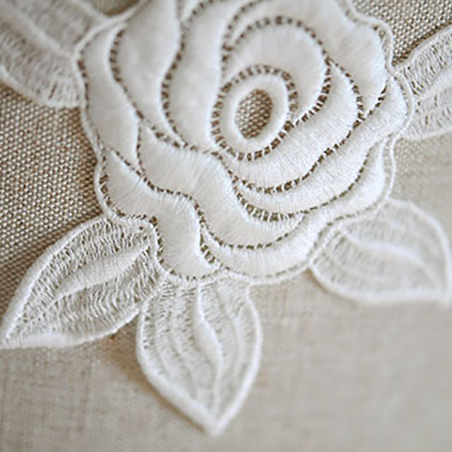 コットン糸のモチーフで上品な光沢、大輪のバラです。 花びらはコットン糸でぷっくりと立体感があり 小物に左右少しずらしてちくちくと丁寧にかがって またビーズをアクセントにつけても素敵です。