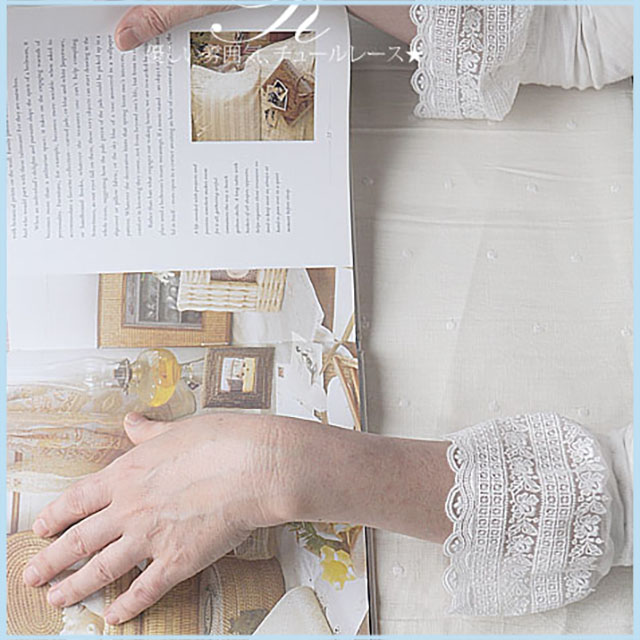 レース幅12cmで繊細な柄のチュールレースです。 白のTシャツを簡単リメイク、袖口に少しレースをギャザーを寄せて縫いつけただけ! ジャケット下に着ると袖口にレースはとても素敵です。 またスソにも、衿元にも、ミシンで縫ってもいいし、ちくちく手縫いでもOK!