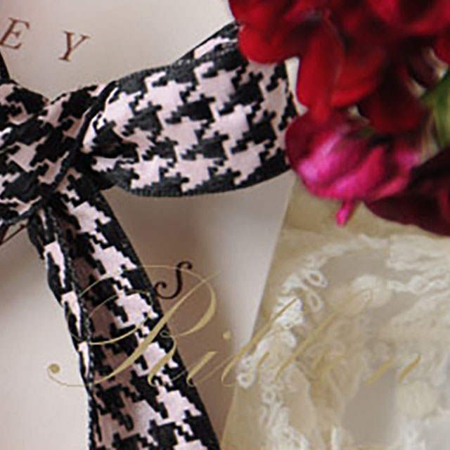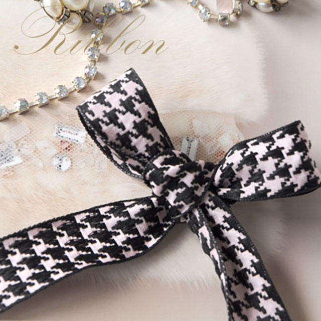 フランスのリボンメーカーオリオール&フォンタネルのワイヤー入りリボン 両端に細いワイヤーが入っていますのでリボンが作りやすいです☆ 可愛い千鳥格子でピンクのベースに黒がとてもおしゃれです 手作りのセーターなどの贈り物に可愛いリボンをきゅっと結んで☆