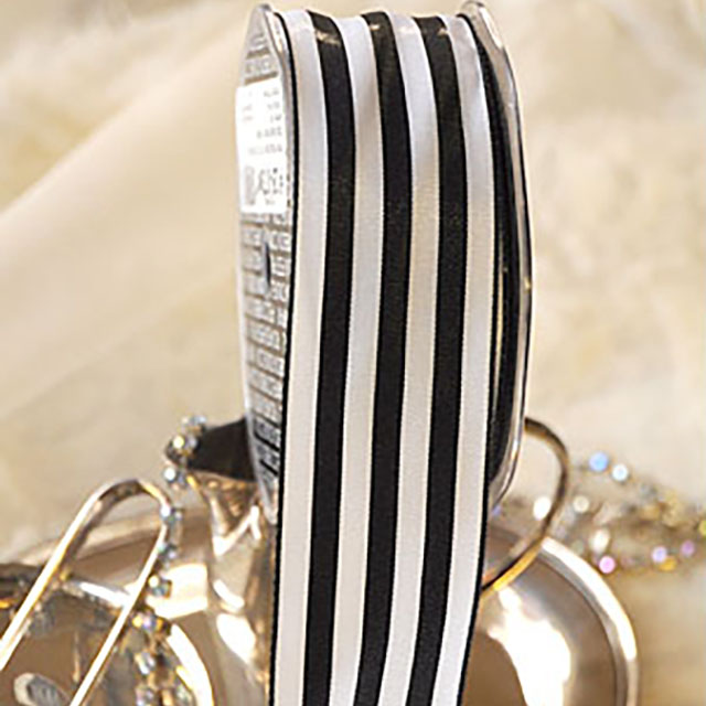 シックでおしゃれな白黒ストライプのリボンはワインやアクセサリーの贈り物によく似合います。 またお人形の帽子に大きく結ぶとおしゃれで素敵です。